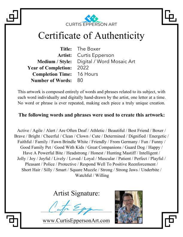 For this Boxer piece, I carefully selected words like dignified, funny, and protective, along with phrases such as “great companions,” “best friend,” and “have a powerful bite!” In total, you’ll find over 55 words and phrases hidden throughout this artwork, each one celebrating the strength, humor, and loyalty of this remarkable breed.
