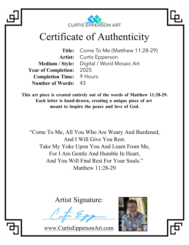I created this piece as a visual expression of peace, surrender, and spiritual rest, made entirely from the comforting words of Matthew 11:28–29. It’s one of the most reassuring invitations in Scripture—a promise that no matter the weight we carry, we can find rest for our souls in Him.