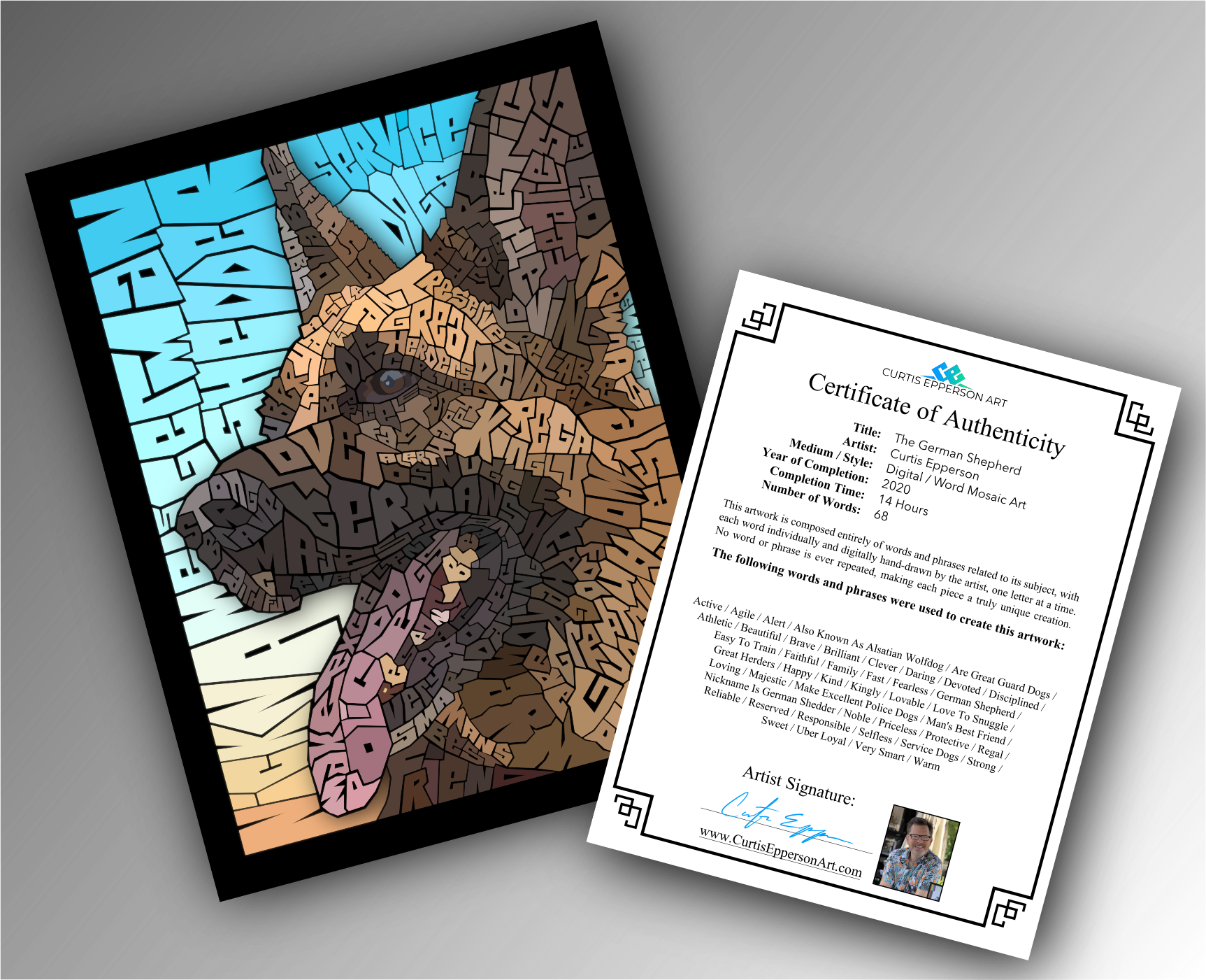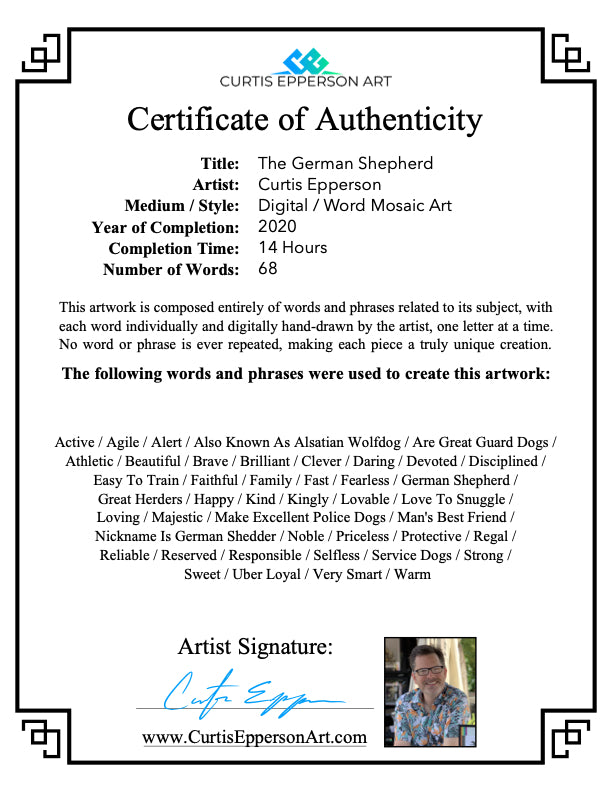 For this German Shepherd piece, I carefully selected words like brave, brilliant, and priceless, along with phrases such as “easy to train,” “man’s best friend,” and “also known as Alsatian Wolfdog.” In total, you’ll find over 45 words and phrases hidden throughout this artwork, each one celebrating the intelligence and devotion of this incredible breed.