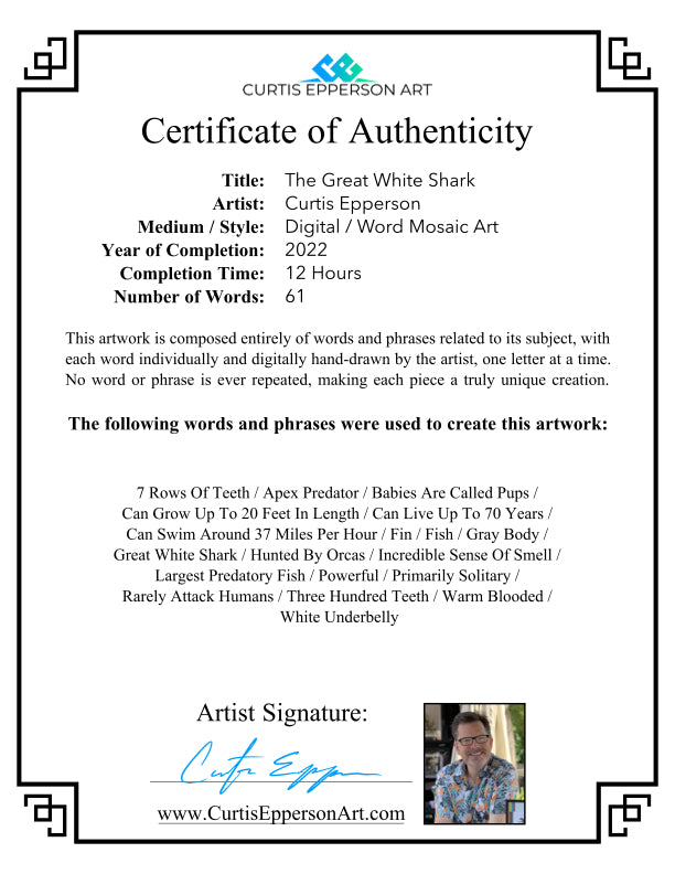 For this Great White Shark piece, I carefully selected words like powerful, warm-blooded, and primarily solitary, along with phrases such as “7 rows of teeth,” “largest predatory fish,” and “hunted by orcas.” In total, you’ll find over 30 words and phrases hidden throughout this artwork, each one capturing the awe-inspiring nature of this apex predator.
