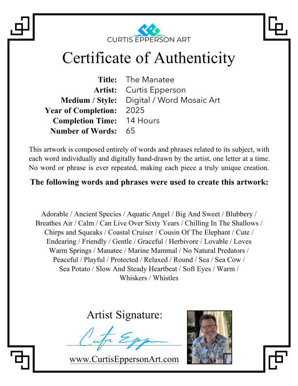For this Manatee piece, I carefully selected words and phrases like “coastal cruiser,” “cousin of the elephant,” “chirps and squeaks,” and “no natural predators.” In total, you’ll find over 35 words and phrases hidden throughout the design, each one capturing the lovable spirit of this aquatic angel.