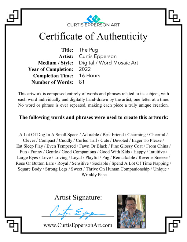 For this Pug piece, I carefully selected words like charming, intuitive, and playful, along with phrases such as “eat sleep play,” “good with kids,” and “reverse sneeze.” In total, you’ll find over 40 words and phrases hidden throughout this artwork, each one celebrating the lovable and quirky nature of the Pug.