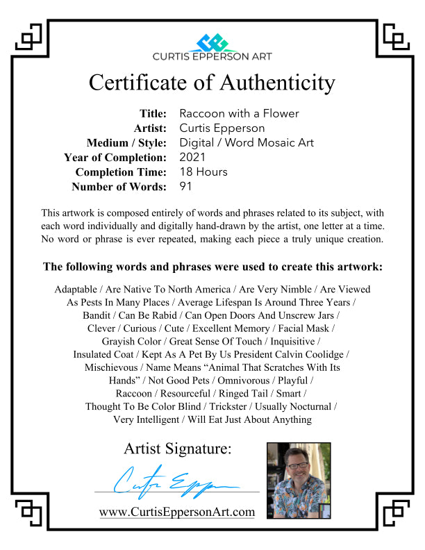 For this “Raccoon with a Flower” piece, I carefully selected words like clever, mischievous, and bandit, along with phrases such as “excellent memory,” “usually nocturnal,” and “not good pets!” In total, you’ll find over 30 words and phrases hidden throughout this artwork, each one celebrating the intelligence and playfulness of this fascinating animal.