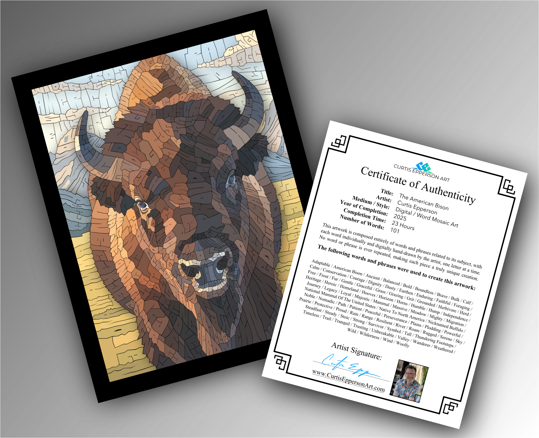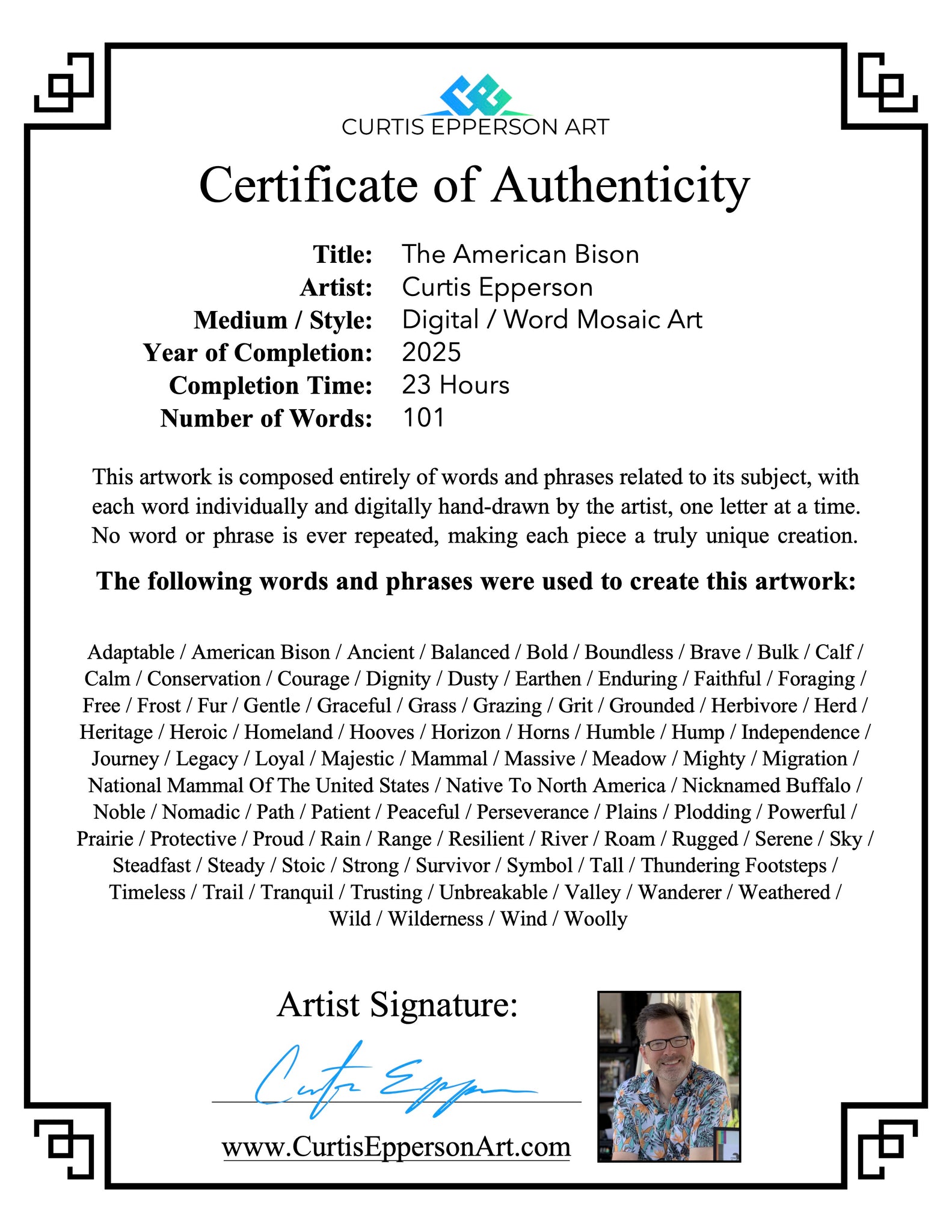 For this American Bison piece, I carefully selected words like majestic, resilient, and unbreakable, along with phrases such as “Thundering Footsteps” and “Native to North America.” In total, you’ll find over 80 words and phrases hidden throughout the design, each one celebrating the bison’s dignity, strength, and timeless connection to the wilderness it calls home.