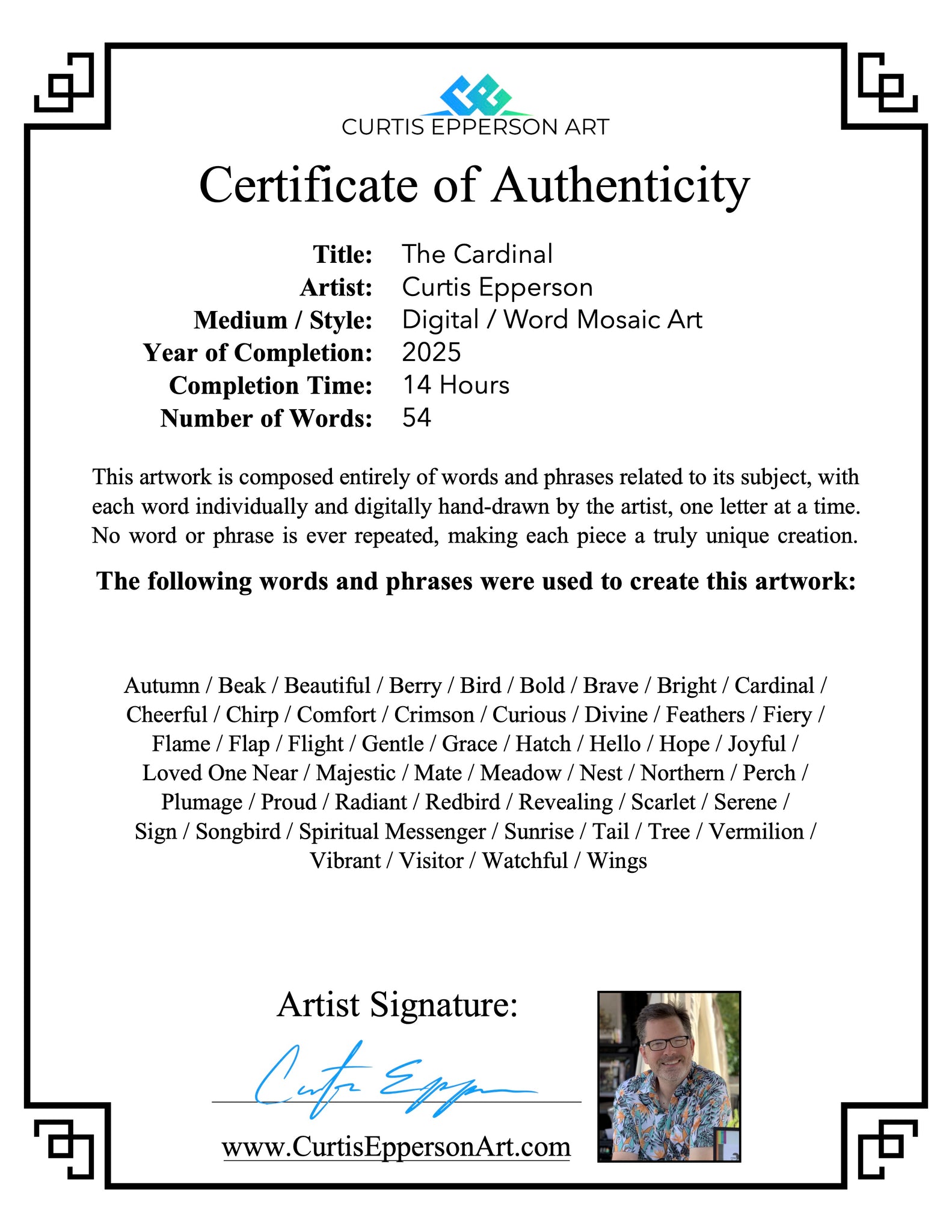 For this Cardinal piece, I carefully selected words like Crimson, Gentle, Proud, and Watchful, along with phrases such as “Loved One Near” and “Spiritual Messenger." In total, you’ll find dozens of words and phrases woven throughout the design, each one celebrating the beauty, comfort, and symbolism of this radiant bird.