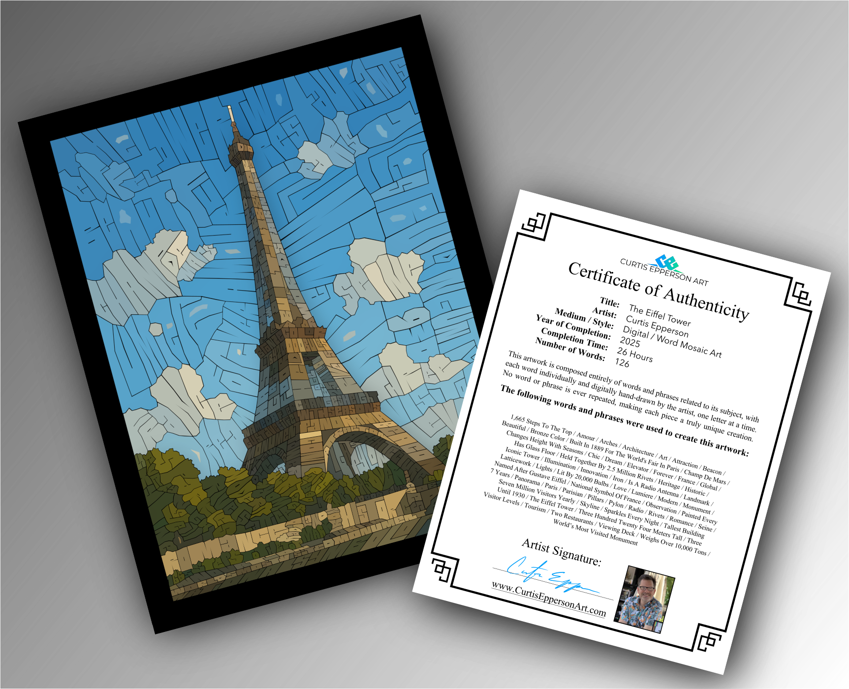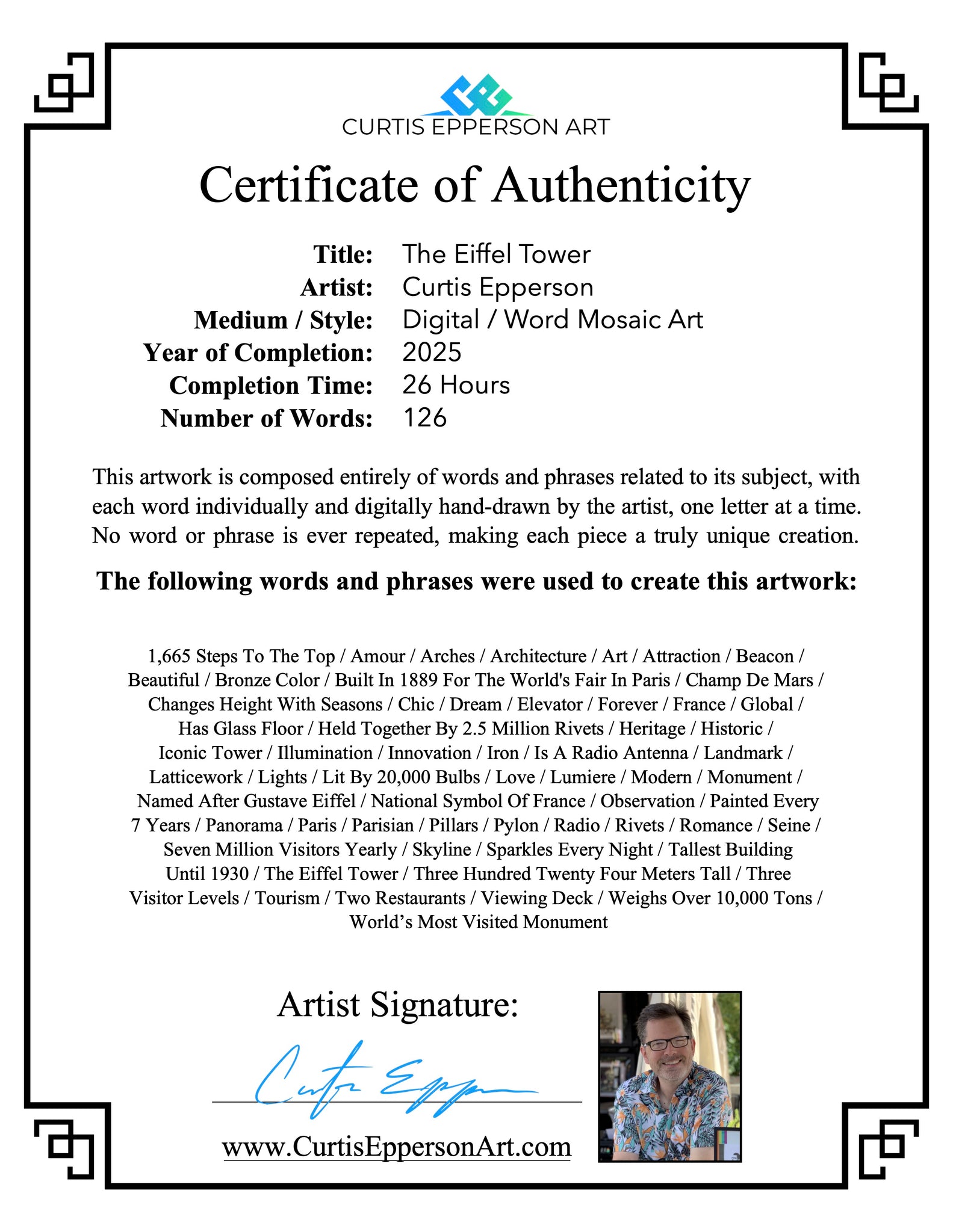 For this Eiffel Tower piece, I carefully selected words like Amour, Arches, Bronze Color, and Panorama, along with phrases such as “1,665 Steps To The Top,” “Lit By 20,000 Bulbs,” and “Sparkles Every Night.” In total, you’ll find over 100 words and phrases woven throughout the design, each one celebrating the beauty, history, and timeless spirit of this Parisian landmark.