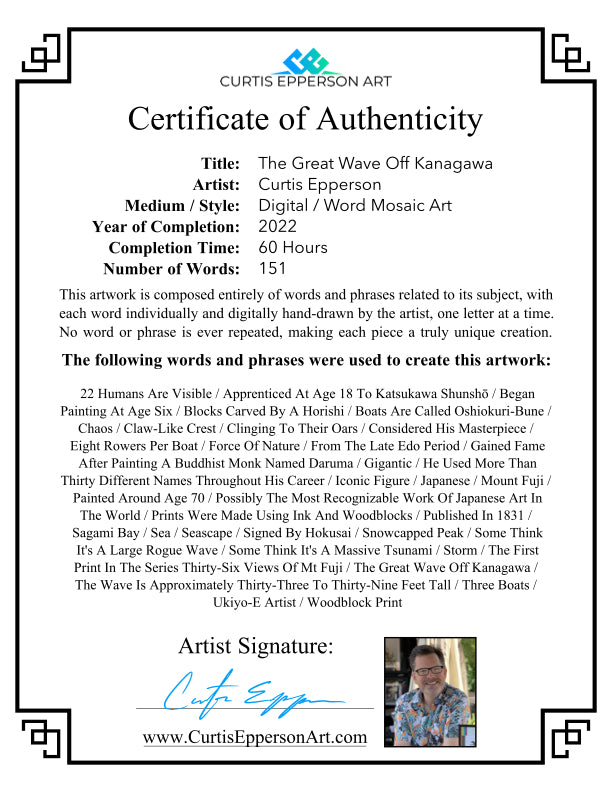 In total, there are almost 40 words and phrases woven into this artwork, each one celebrating Hokusai's brilliance and the enduring impact of The Great Wave Off Kanagawa.