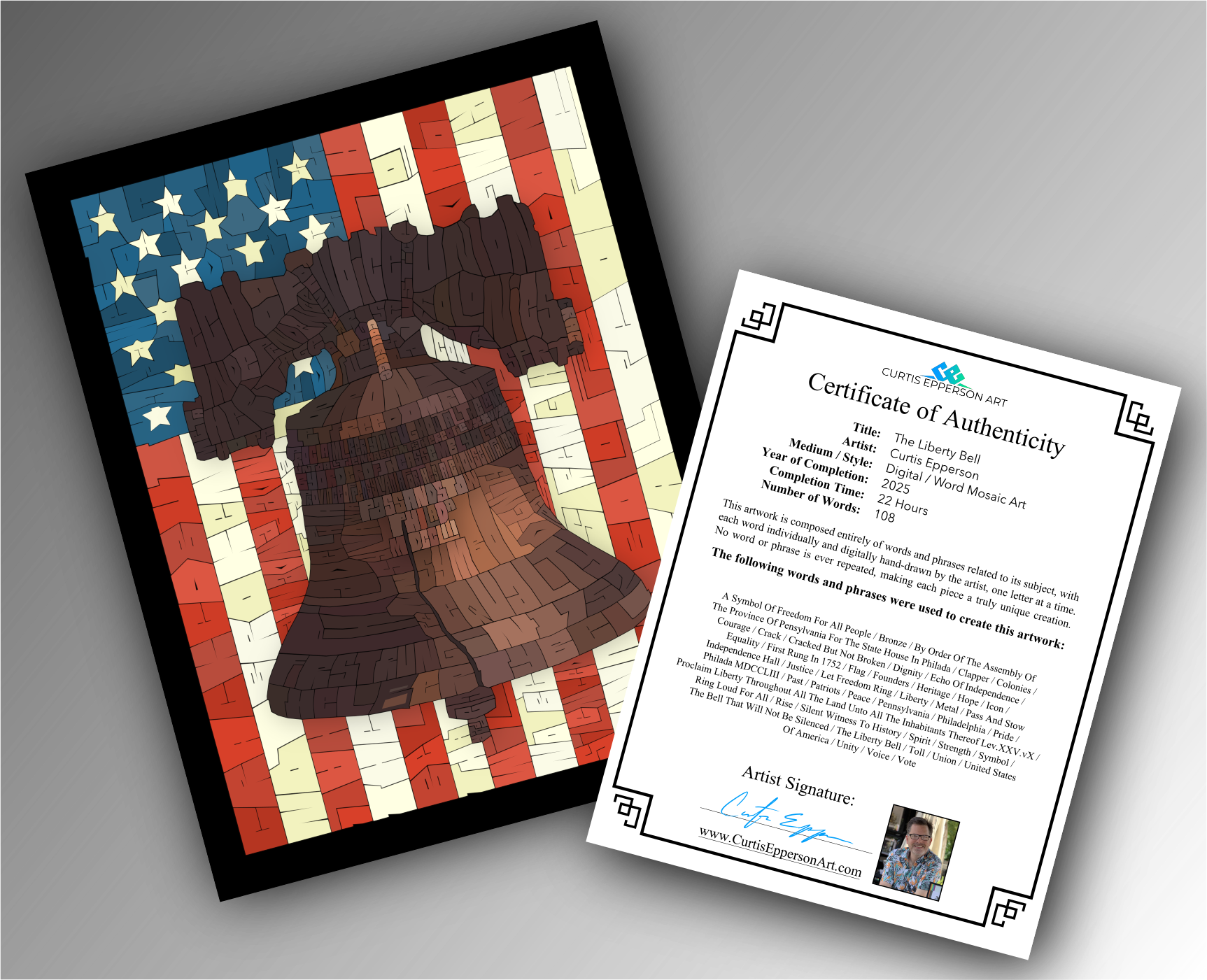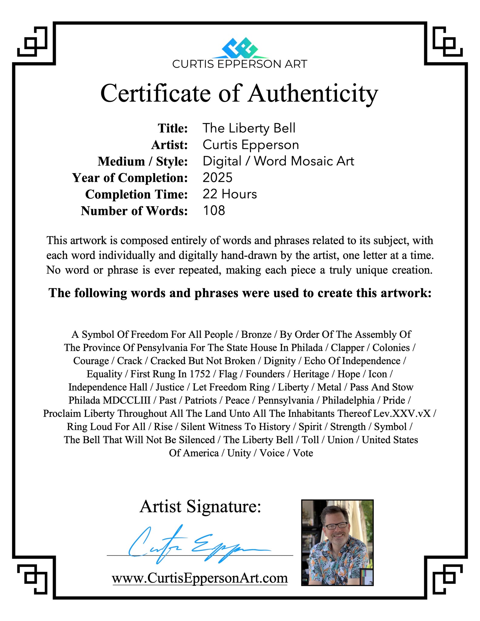 For this Liberty Bell piece, I carefully selected words like Bronze, Clapper, Courage, Justice, and Unity, along with phrases such as “The Bell That Will Not Be Silenced,” “Echo of Independence,” and “Ring Loud For All.” In total, you’ll find over 50 words and phrases woven throughout the design, each one celebrating the history, symbolism, and timeless spirit of this American treasure.