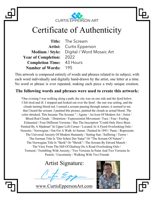 Hidden within this digitally hand-drawn word art, you’ll find fascinating facts about both the painting and its artist, including words like “terror,” “blood red clouds,” and “panic,” as well as phrases such as “walking with two friends,” “trembling with anxiety,” and “four different versions.”