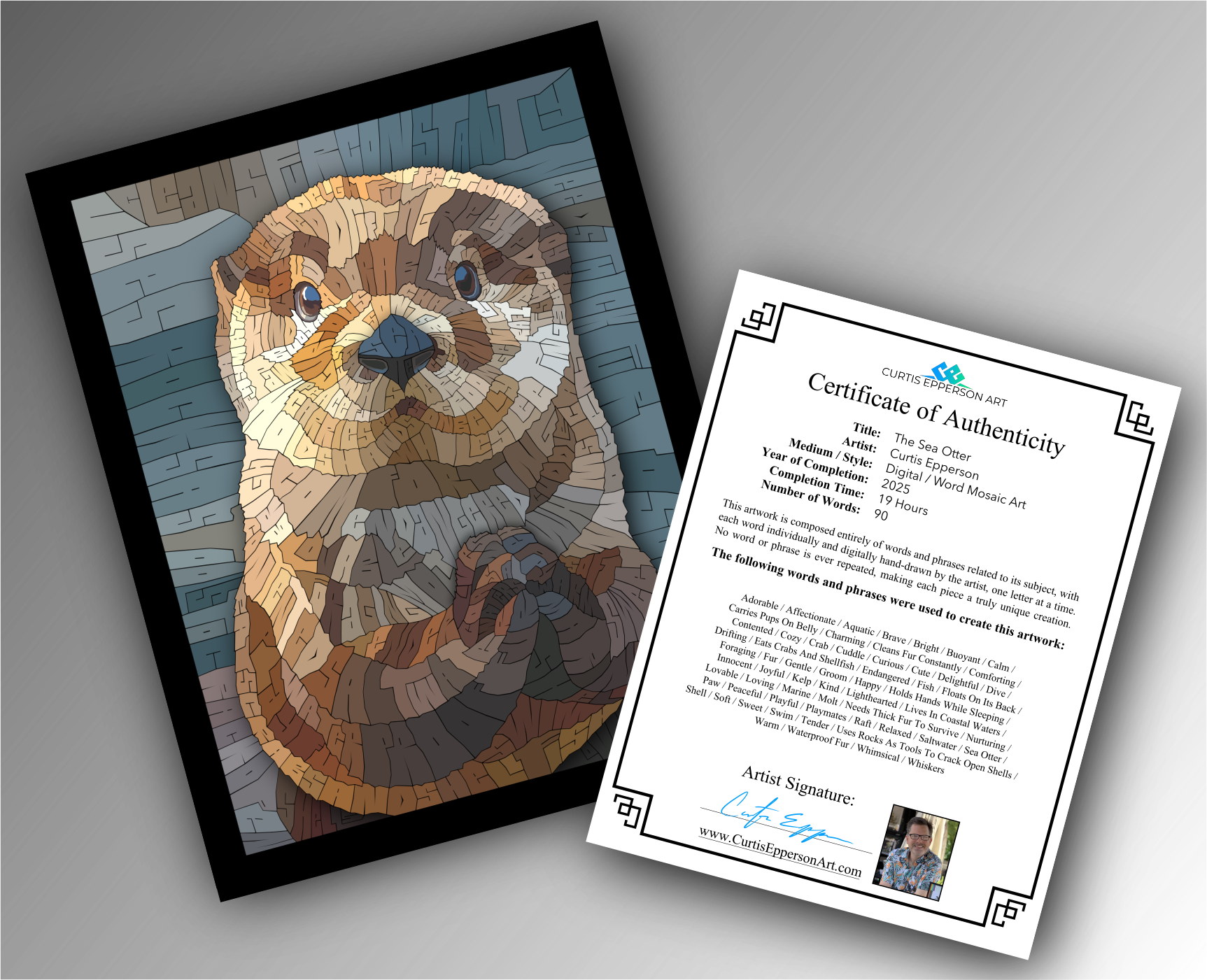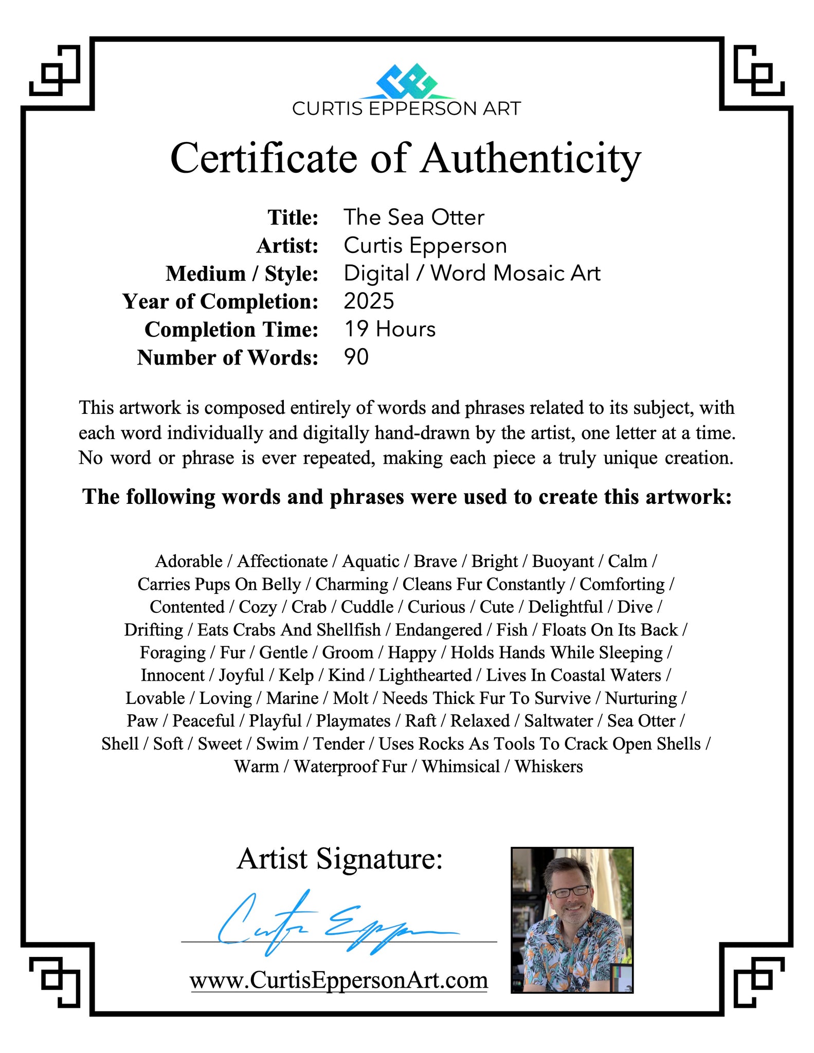 For this Sea Otter piece, I carefully selected words like adorable, nurturing, and lighthearted, along with phrases such as “Floats on Its Back,” “Carries Pups on Belly,” and “Uses Rocks as Tools to Crack Open Shells.” In total, you’ll find over 70 words and phrases hidden throughout the design, each one celebrating the sea otter’s gentle spirit, playful personality, and deep connection to its ocean home.