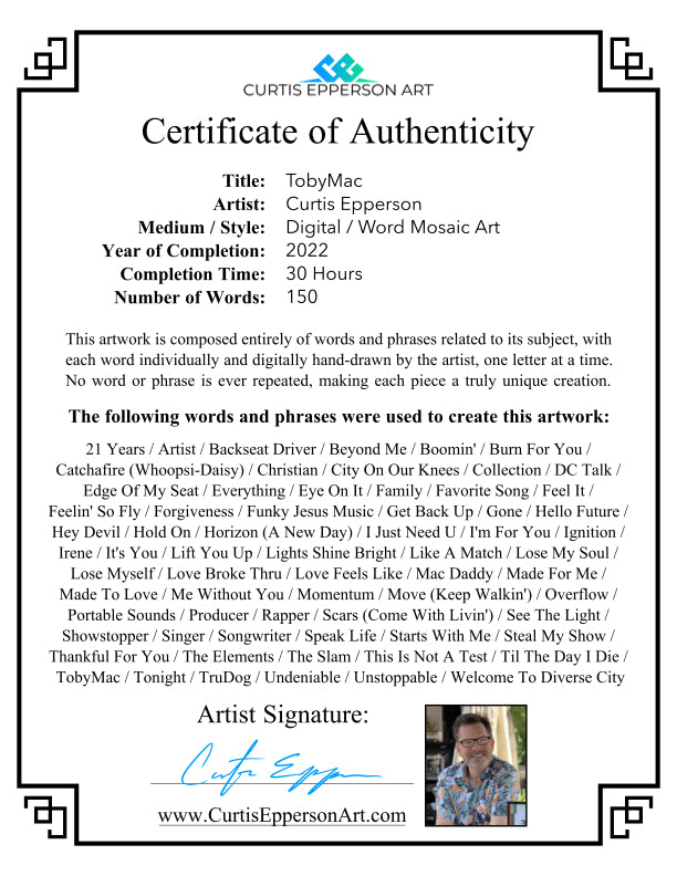 Included in this "TobyMac - Collection" word mosaic, you’ll find the titles of all of his songs and albums, plus a few hidden surprises woven into the design!